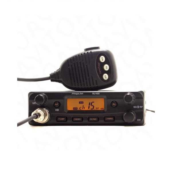К основным функциональным возможностям MegaJet MJ-450 относятся: функция сканирования (SC), упрощающая поиск нужного канала и сканирование по двум каналам (DW), звуковое сопровождение нажатия клавиш (ВР),кнопка (RU) -переключение в Российский стандарт (-5КГц). Также имеется возможность подключения внешнего громкоговорителя. Корпус выполнен в классическом форм-факторе в виде моноблока. Крышки корпуса, как и у предшественников, привинчиваются к шасси отдельно каждая. Краска матовая, соответственно, отпечатки пальцев на нем не видны. Кнопка автоматического шумоподавителя присутствует только на тангенте, и не дублируется на передней панели радиостанции.