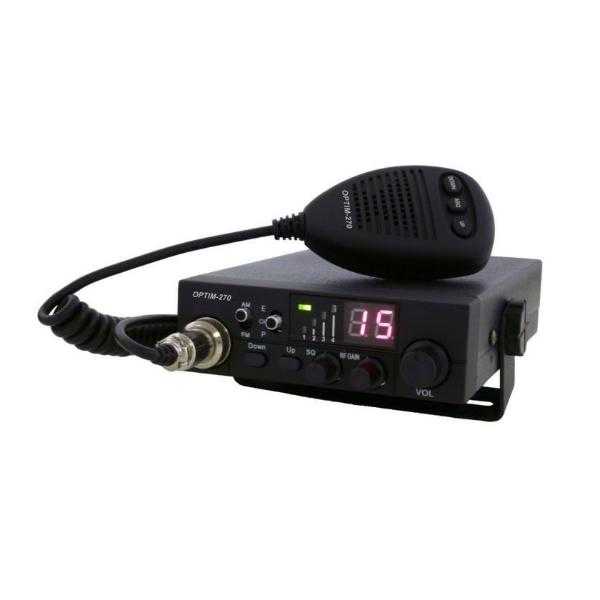 Автомобильная радиостанция Optim-270 для работы и общения в Си-Би диапазоне 25,615 - 28,305 МГц, включая гражданский Си-Би. Отличительными особенностями рации являются максимальная простота и продуманности организации управления, возможность выбора уровня выходной мощности - высокий до 10 Ватт и низкий до 4 Ватт, удобные тактильно ощутимые дискретные органы управления, наличие не только ручного порогового, но и автоматического спектрального шумоподавителя ASQ, возможность работы в "нулях" и "пятёрках".