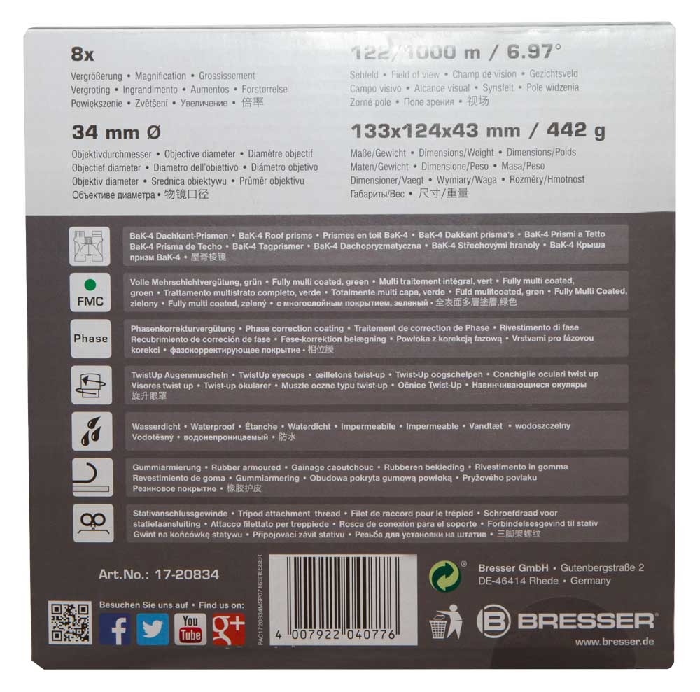 Bresser Pirsch 8x34 – небольшой и мощный бинокль для путешествий и прогулок на природе. Благодаря широкому полю зрения он отлично подходит и для просмотра спортивных мероприятий на стадионе. Герметичная конструкция позволяет использовать Bresser Pirsch 8x34 на воде или вблизи нее, например во время водных вояжей, на рыбалке или пикнике.