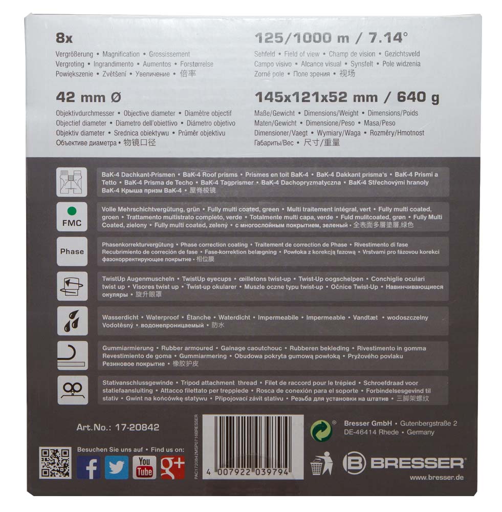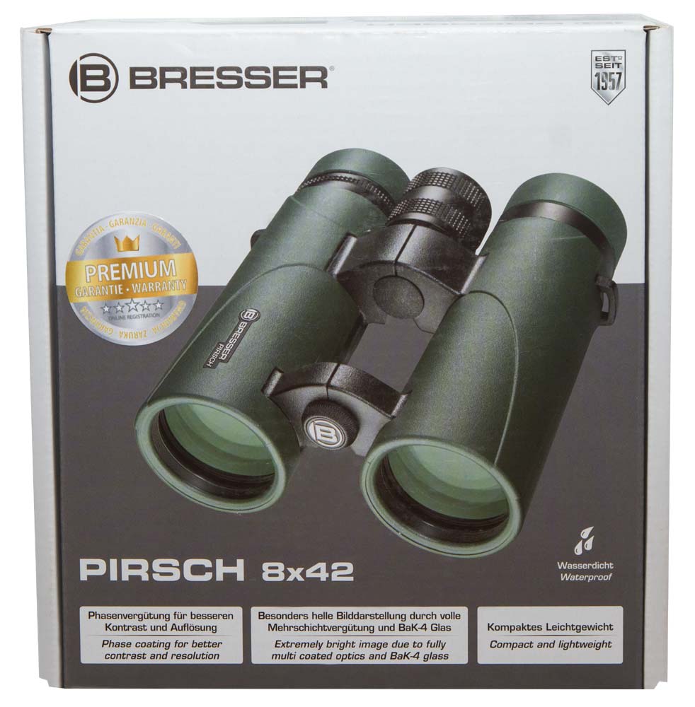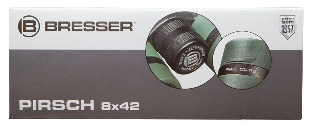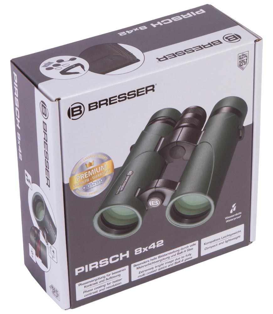 Полевой бинокль Bresser Pirsch 8x42 – это неприхотливый и безотказный оптический прибор с оптикой премиум-класса. Он отлично подходит для любых наблюдений на открытом воздухе. Бинокль можно брать в поход, на охоту, рыбалку или прогулку по лесу – в любой ситуации Bresser Pirsch 8x42 справится на «отлично». Он не боится воды, поэтому сможет сопровождать вас при любой погоде.