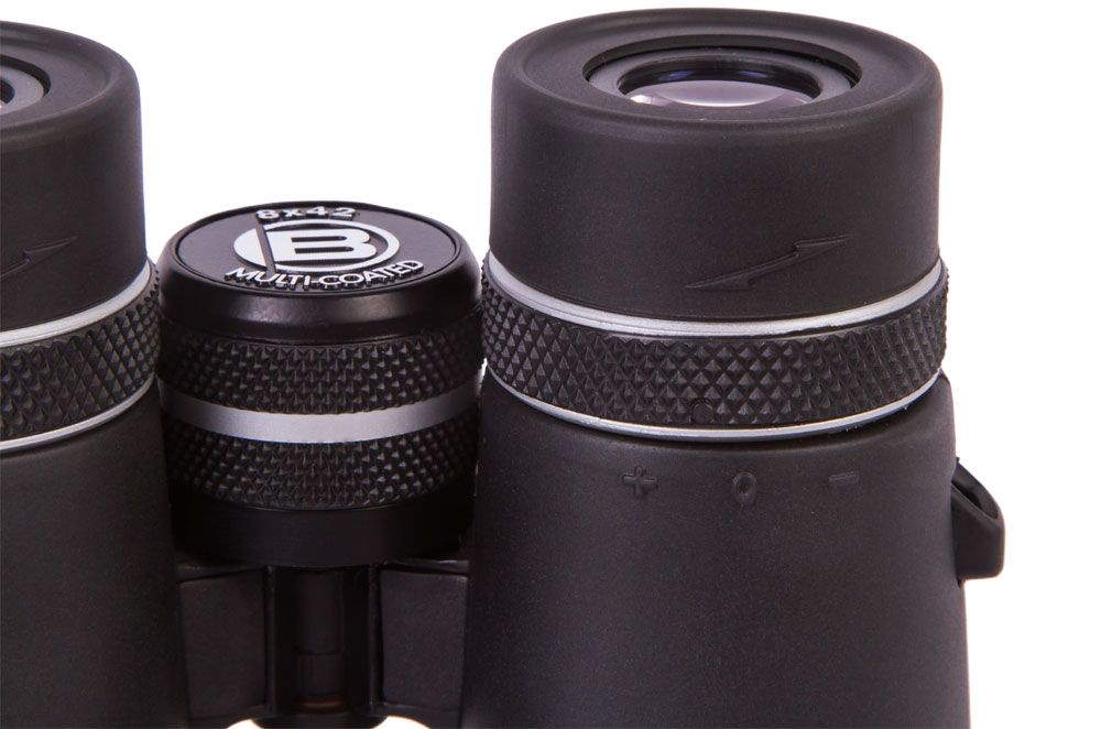 В бинокле присутствуют все базовые настройки: центральная фокусировка, регулировка межзрачкового расстояния, корректировка диоптрий на правом окуляре, возможность изменения положения поворотно-выдвижных наглазников. Окуляры с вынесенным зрачком удобны для тех, кто привык вести наблюдения в очках.