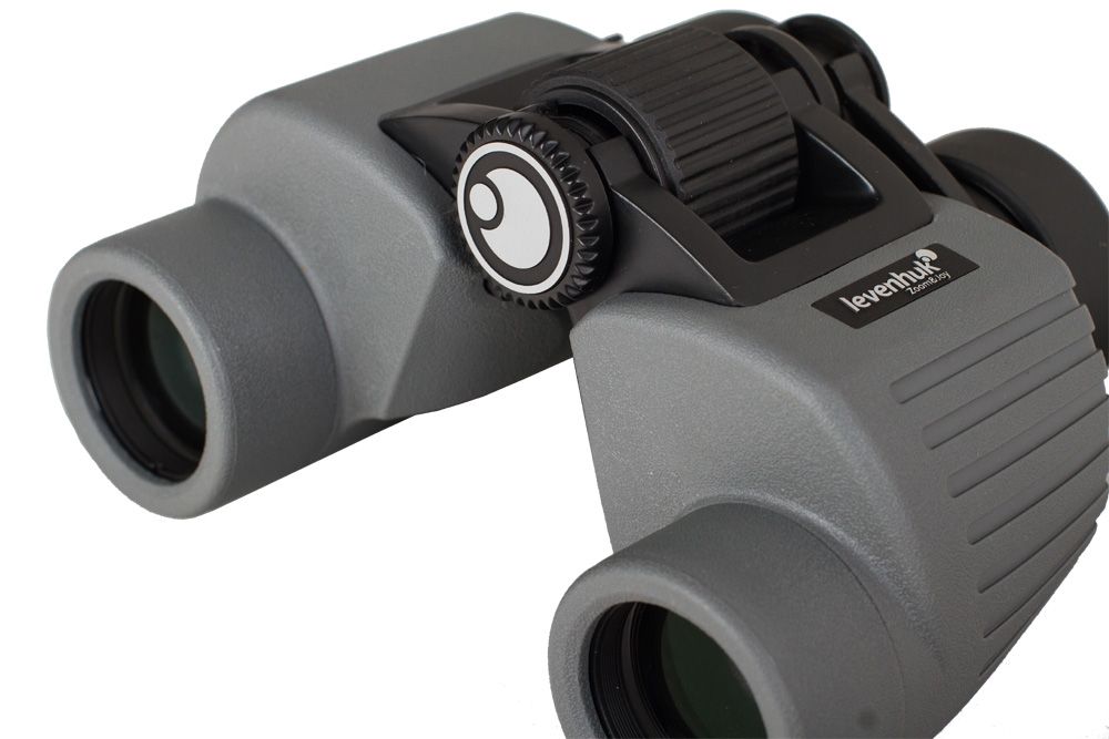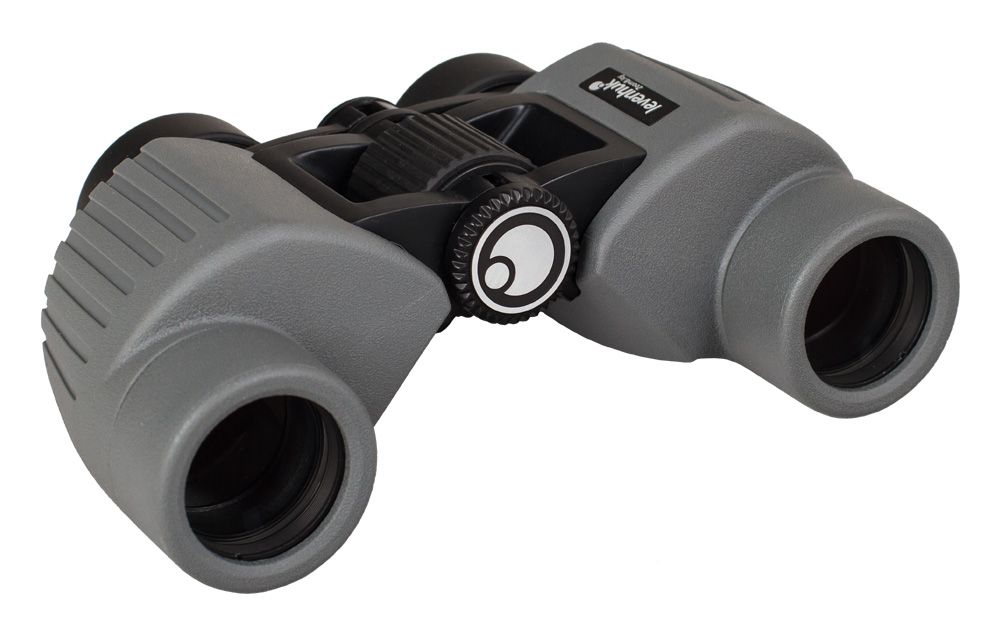 Благодаря герметичной конструкции пыль, грязь и влага не попадают внутрь бинокля. Корпус покрыт плотной светло-серой резиновой оболочкой – она смягчает удары и обеспечивает надежный захват.