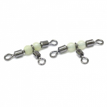 Тройные вертлюги отлично подходят для донных оснасток, так как позволяют поводкам не перепутаться. Модель EP-103 имеет одинарные цилиндрические корпуса с ушками округлой формы. Дополнены бусинами белого цвета. Показатель разрывной нагрузки может составлять от 9 до 30 кг в зависимости от номера оснастки.