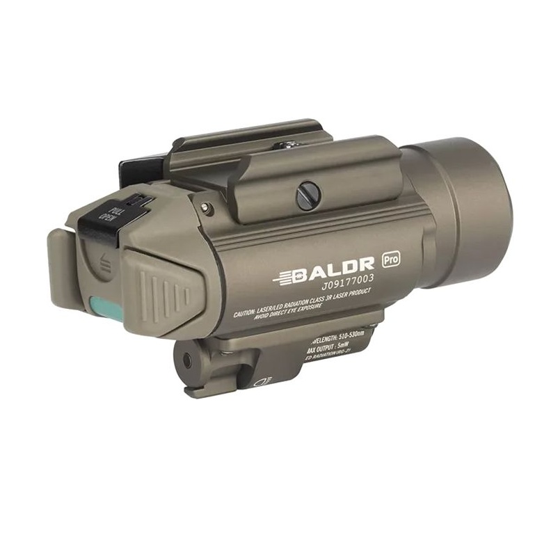 Пистолетный тактический фонарь Olight Baldr Pro от компании Olight (Олайт) с лазерным целеуказателем зеленого цвета длинной волны 510–530 нМ, который позволяет вести прицельные выстрелы. Мощность белого света составляет 1350 люмен и дальность 260 метров.