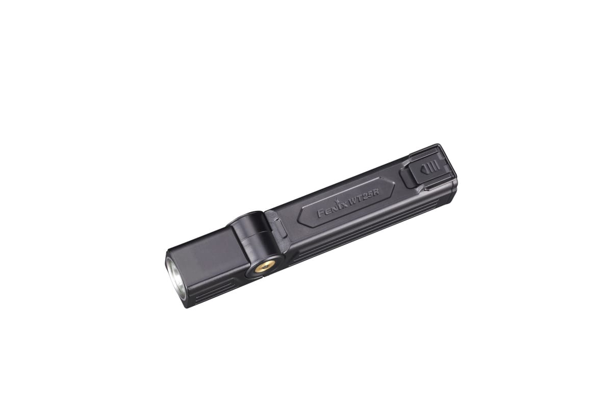 Модель Fenix WT25R характеризуется уникальным дизайном корпуса. Она имеет встроенную клипсу, чтоб использовать фонарь было ещё удобнее и легче. При желании вы можете установить его вертикально, как свечку, и руки при этом остаются свободными для выполнения дел. Либо же можно примагничивать фонарь к металлическим поверхностям. Управление происходит при помощи одной кнопки, она располагается сбоку корпуса, на оси регулировки «головы». Контакты тут позолоченные, за счёт чего обеспечена замечательная электрическая проводимость. Кроме того, позолота защищает контакты от ржавчины.