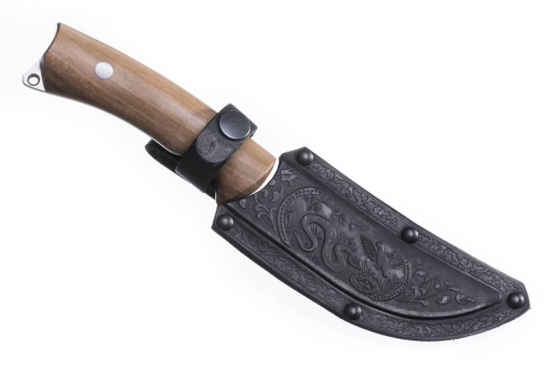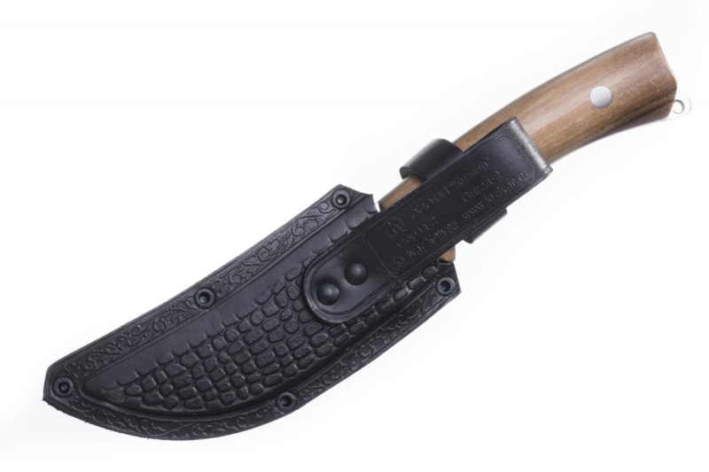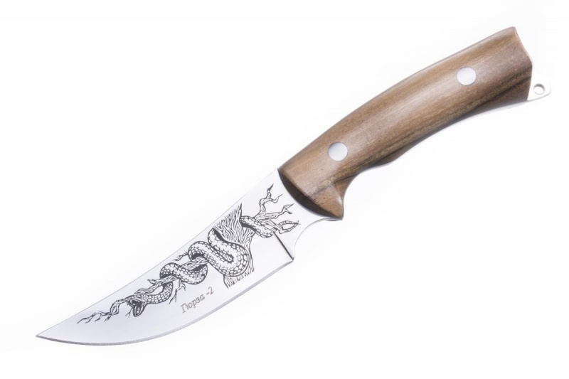 Гюрза-2 - один из первых ножей нашего производства. Нож не потерял за многие годы свою популярность благодаря своему уникальному внешнему виду и функциональным свойствам. Изогнутый клинок с подпальцевой выемкой на пяте. Рукоять из кавказского ореха. Поясные ножны из натуральной кожи. Плашки приклепаны к хвостовику.
