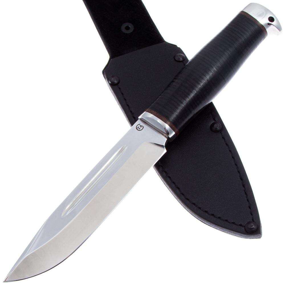 Рукоять имеет обмотку из натуральной кожи — это довольно популярный материал, используемый при изготовлении рукоятей охотничьих ножей. Она хорошо удерживает тепло и не позволяет руке скользить.