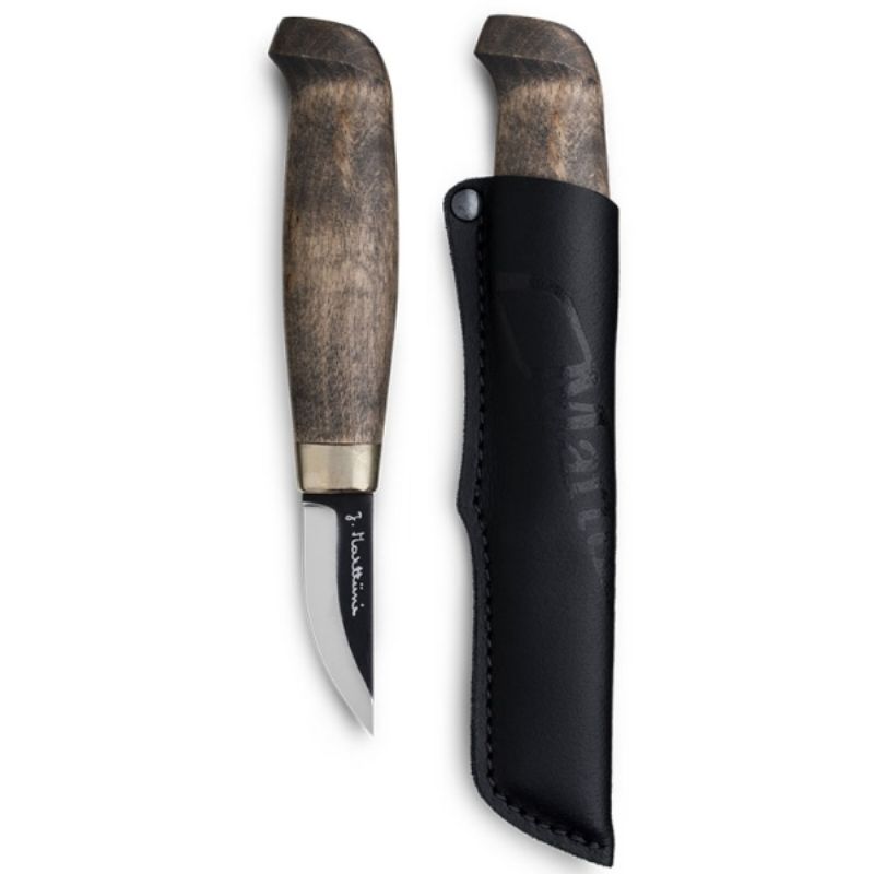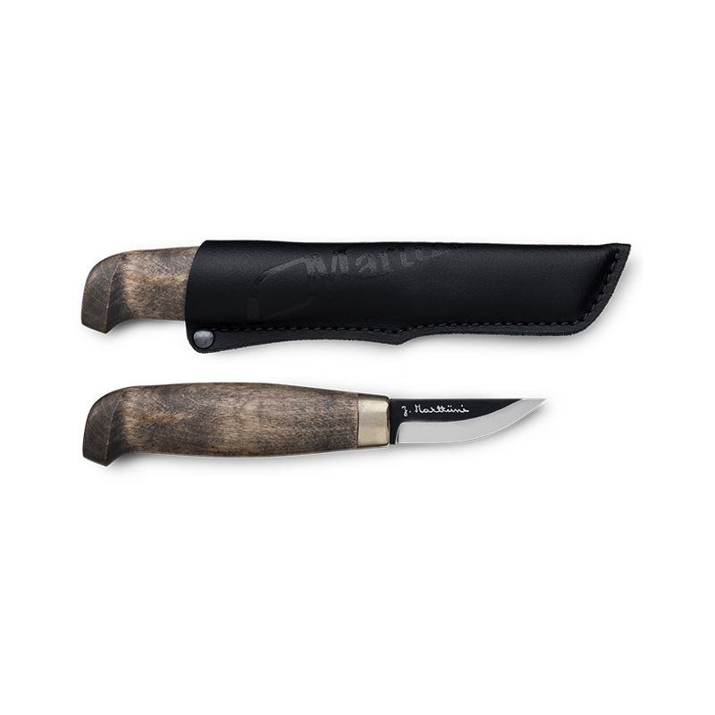 Лезвие из углеродистой стали длиной 6 см удобно в использовании и легкое в заточке. Форма ручки соответствует традиционной ручке Marttiini Lynx. Березовая ручка пропитанная воском, приятно и надежно лежит в руке. Черные кожаные ножны с логотипом Marttiini.