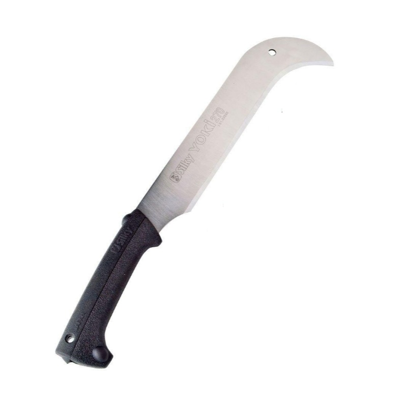 Мачете Silky Yoki имеет изогнутое на конце лезвие позволяет рубить гибкий кустарник. Благодаря специальной легированной стали этот топор имеет тонкое и легкое лезвие наряду с высокими режущими свойствами. Лезвие имеет цельную конструкцию и проходит через всю рукоять. Резиновые съемные рукояти предотвращают выскальзывание мачете даже из мокрых рук. Кроме того такая рукоять на 60% уменьшает отдачу на руку по сравнению с деревянной рукоятью. Поставляется с поясным чехлом из нейлона.