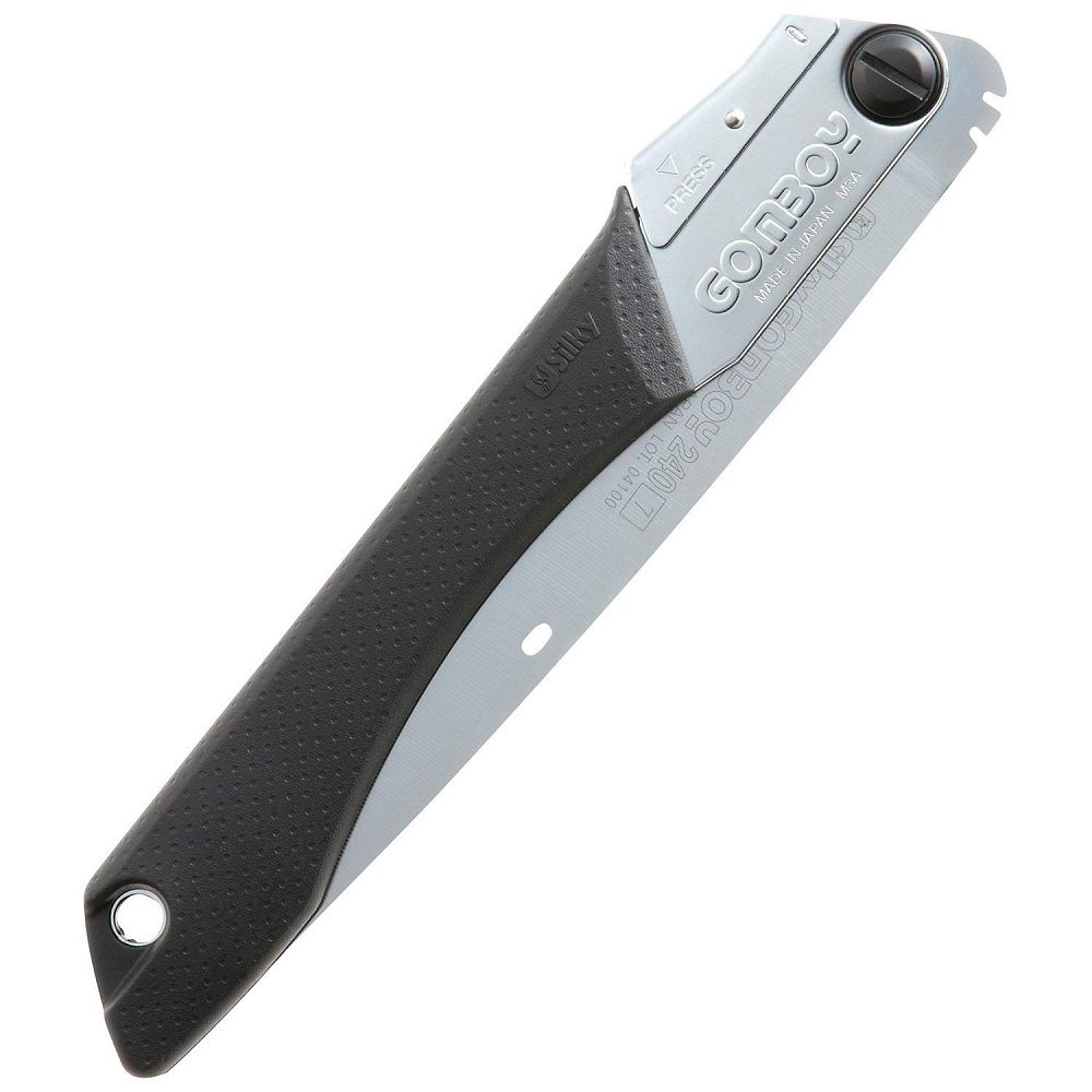 Пила складная Silky Saw GOMBOY 240 мм 10 зубьев на 30 мм чёрная рукоять 121-24 -лёгкий, прочный и компактный походный инструмент, для мелких и средних веток и стволов. В лесу Вы быстро напилите дров, на даче - уберёте ненужные ветки с садовых деревьев.Вы сможете пилить и в поперечном направлении, и в продольном, и по диагонали.Конусная форма лезвия сводит на минимум трение и дает возможность сделать зуб пилы без разводки, это обеспечивает тонкий распил, что в свою очередь позволяет прилагать меньше усилий.Прочная, лёгкая и противоскользящая, прорезиненная рукоять из алюминиевого сплава обладает фиксацией в двух положениях для удобства распила в труднодоступных местах.