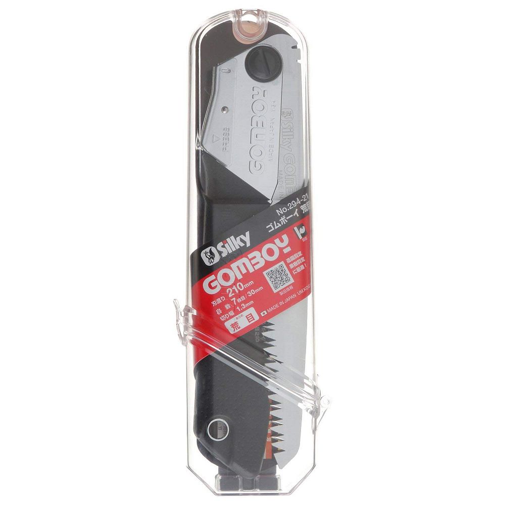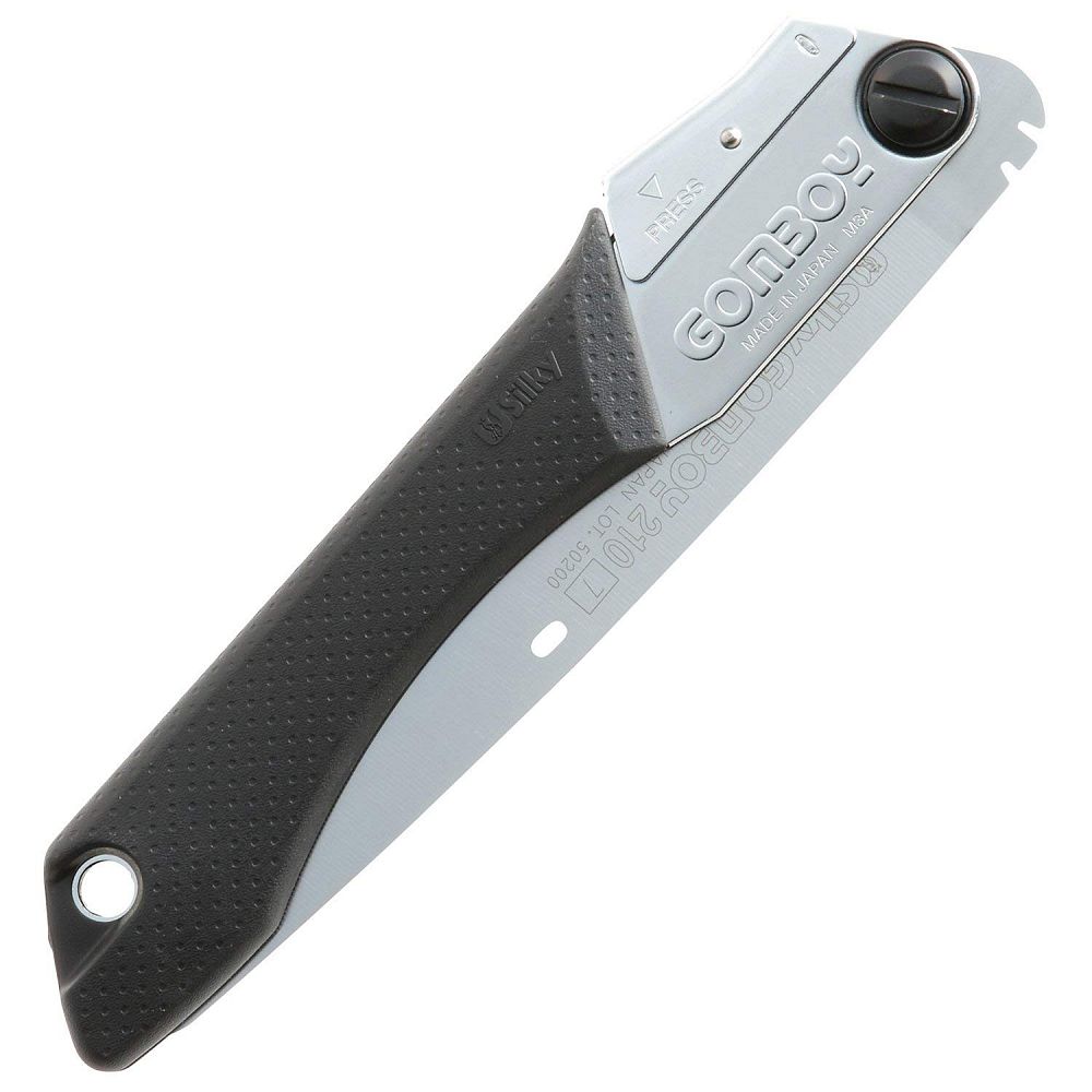 Пила складная Silky Saw GOMBOY 210 мм 10 зубьев на 30 мм чёрная рукоять 121-21 -лёгкий, прочный и компактный походный инструмент, для мелких и средних веток и стволов. В лесу Вы быстро напилите дров, на даче - уберёте ненужные ветки с садовых деревьев.Вы сможете пилить и в поперечном направлении, и в продольном, и по диагонали.Конусная форма лезвия сводит на минимум трение и дает возможность сделать зуб пилы без разводки, это обеспечивает тонкий распил, что в свою очередь позволяет прилагать меньше усилий.Прочная, лёгкая и нескользящая, прорезиненная рукоять из алюминиевого сплава обладает фиксацией в двух положениях для удобства распила в труднодоступных местах.